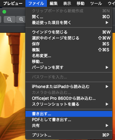 写真を開き、「ファイル」> 「書き出す」を選択します。