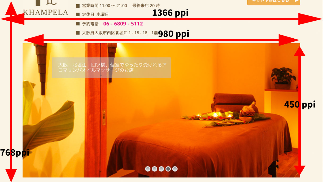 15インチのノートパソコンでHPを閲覧した様子です。ノートの液晶画面サイズの横1366ppi、横768ppiに対して、真ん中の写真のサイズを見ると、横980ppi x 縦450 ppiとなります。