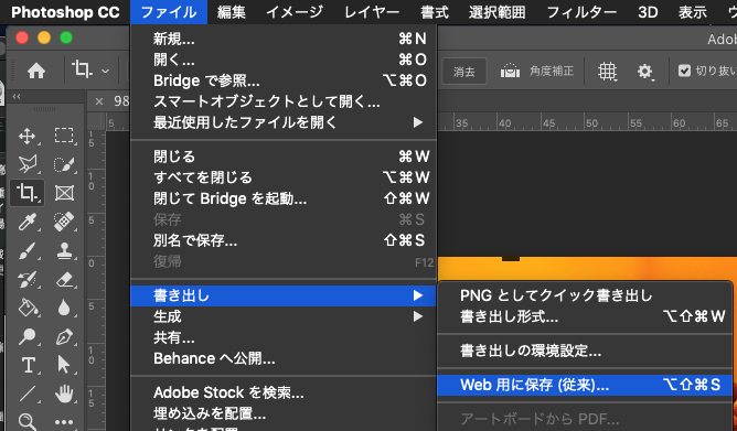 「ファイル」>「書き出し」>「Web用に保存(従来)」をクリックします。